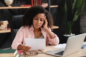 Migraine headache. Sad exhausted depressed tired woman reading document with debt loan mortgage